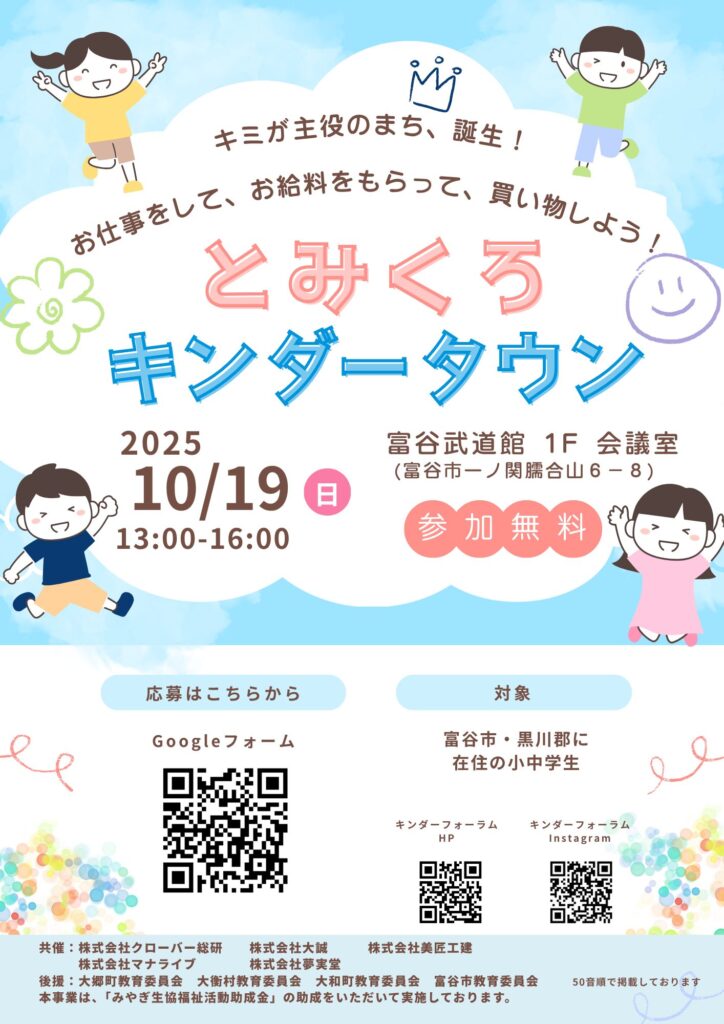 「とみくろキンダータウン」は、こどもたちが主役になって、様々なお仕事を体験できるイベントです。好きなお仕事に挑戦して、お給料をもらって、お買い物をする。そんな社会の仕組みを、遊びながら楽しく学べます! <当日体験できるお仕事ブース>地域の... -